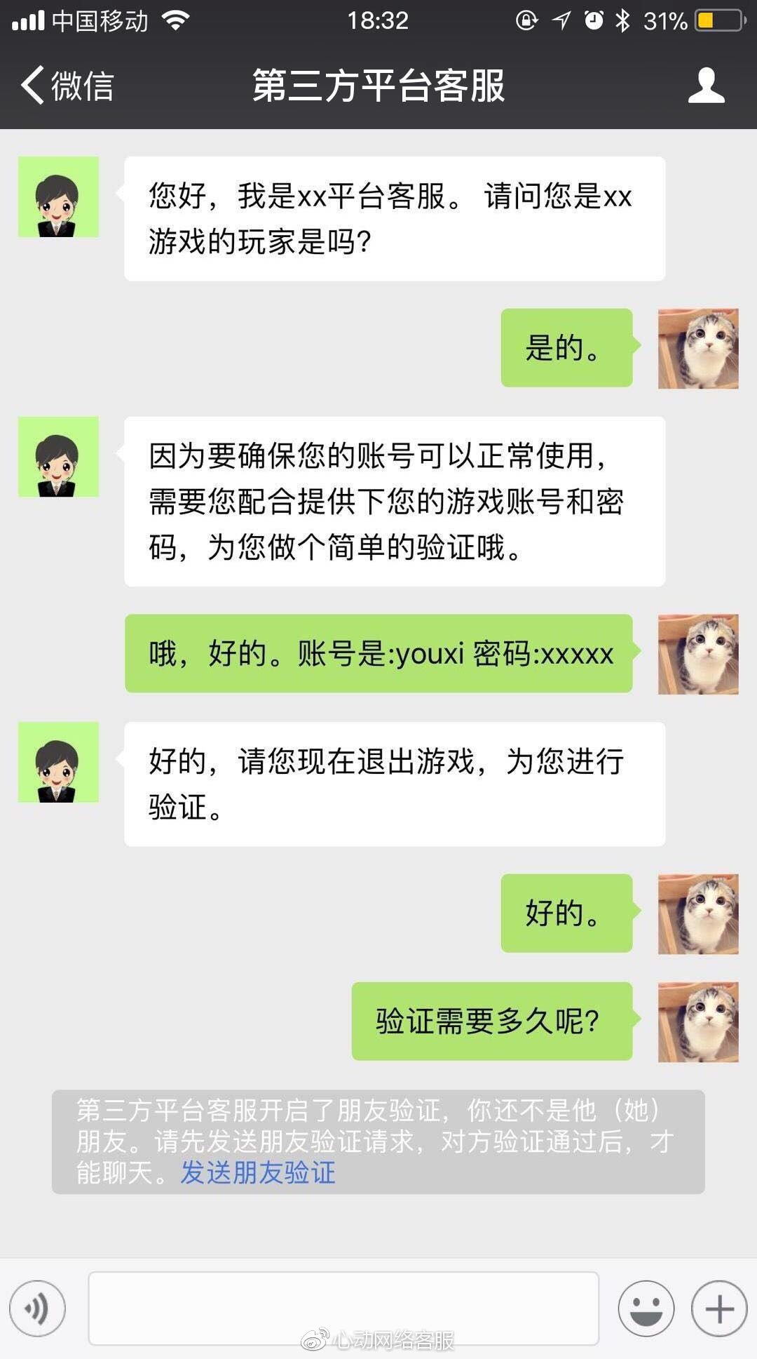 二. 冒充第三方交易平台验证账号密码 骗术:假冒第三方平台客服的身份,以账号验证等借口,向玩家索取账号及密码。骗取玩家的账号密码后,篡改玩家的账号信息。